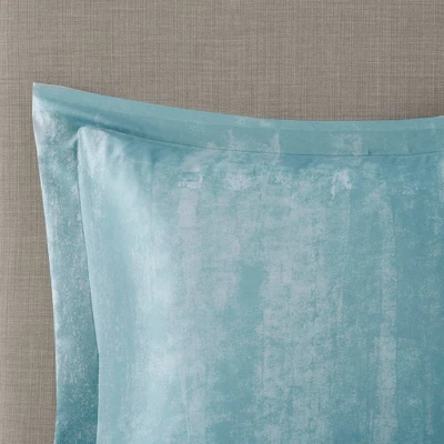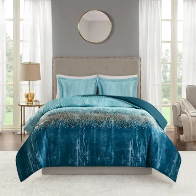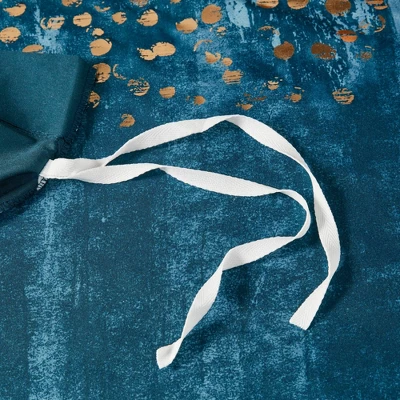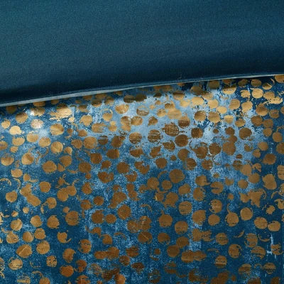 Elevate your bedroom with the glamorous style of the Madison Park Midnight Sky 3 Piece Metallic Print Duvet Set. The duvet cover features a satin charmeuse fabric top, in navy and gray hues, with a gold metallic foil print in the center, creating a stunning luxurious look. A solid navy microfiber reverse adds a soft touch and two matching shams complete the modern duvet cover set. Machine washable in a large capacity washer and dryer, this metallic print duvet cover set transforms your bedroom into a modern and glamorous space. A button closure helps secure a comforter insert within the duvet cover and inside ties in the corners help prevent it from shifting (insert is NOT included).