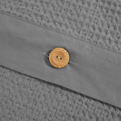 Give your bedroom a simple and clean allure with the Lucina 3pc Cotton Waffle Weave Duvet Cover Set. The 100% cotton duvet cover and shams feature a waffle weave that provides a soft textured look and feel. The button closures allow you to place a comforter insert within the duvet cover and the internal corner ties prevent it from shifting. Decorative wood button details also adorn the face of the duvet cover and shams for a charming and functional accent. With a fresh contemporary style, this cotton duvet cover set is machine washable and pairs perfectly with any bedroom décor.