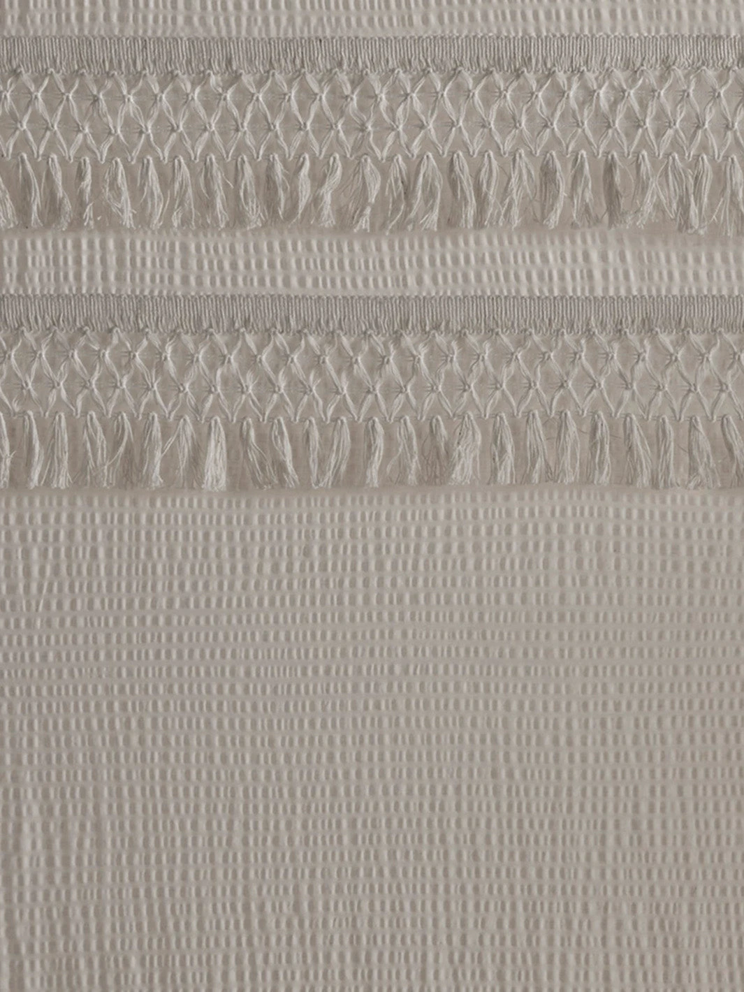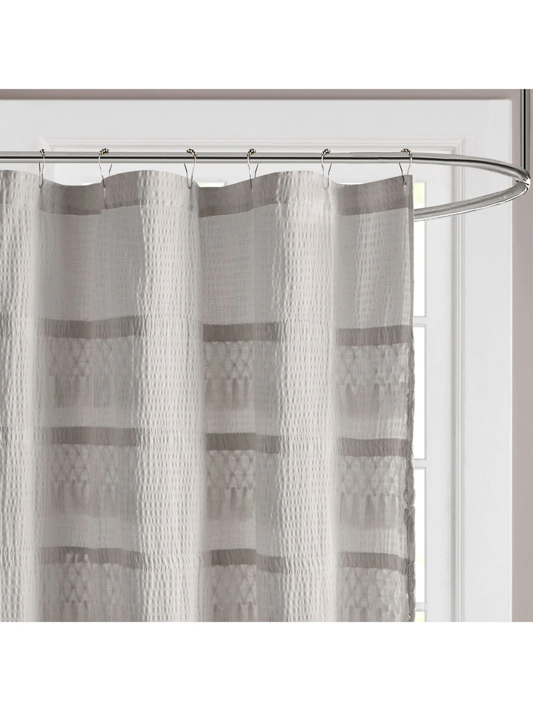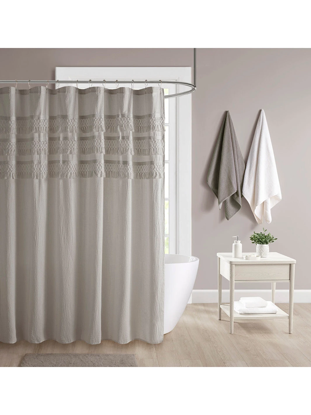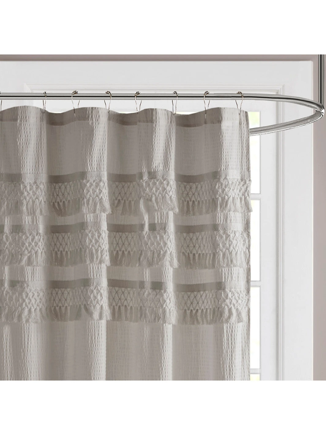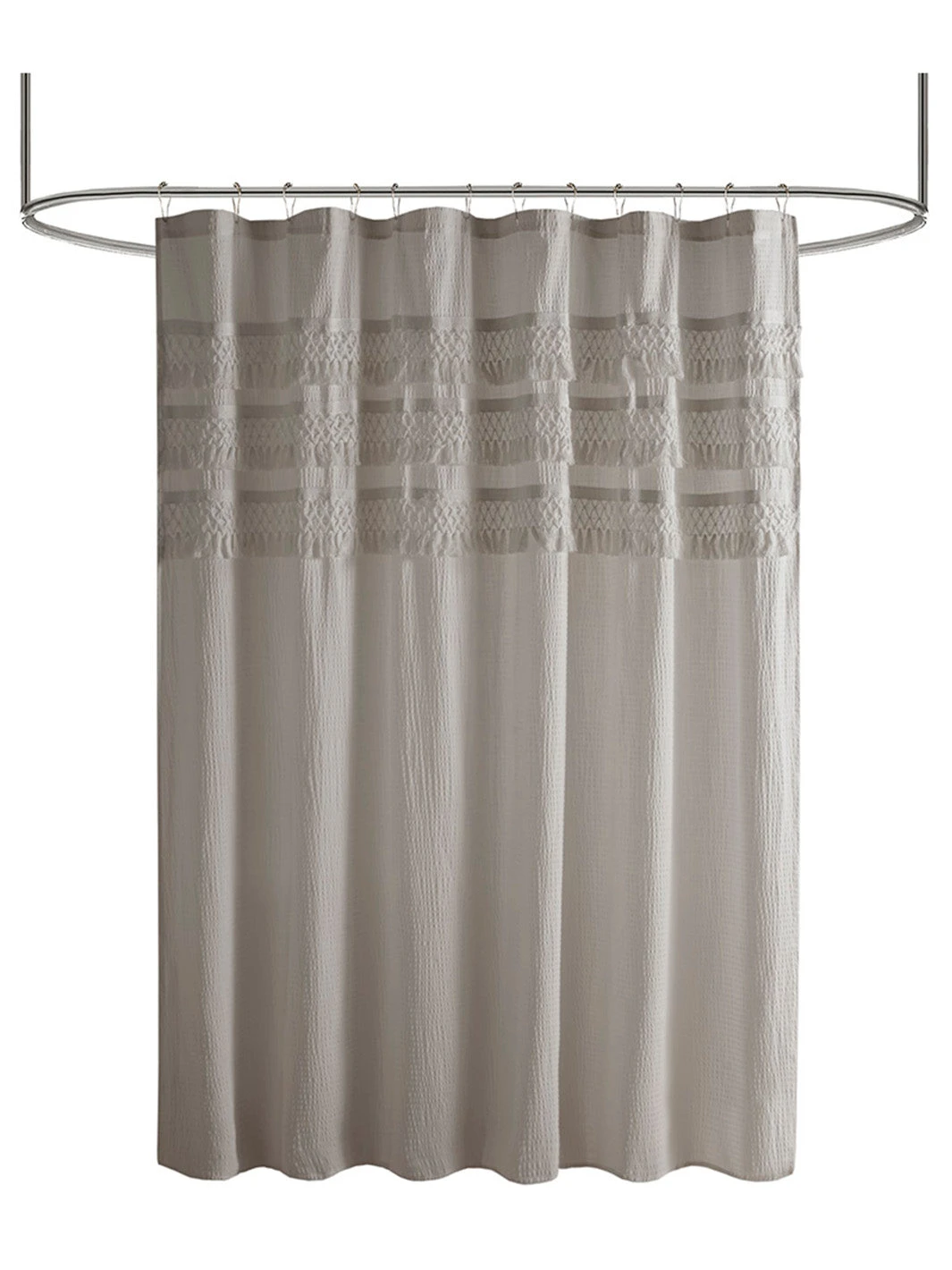 Restyle your bathroom into a shabby chic retreat with our Madison Park Amaya Seersucker Tassel Shower Curtain. The grey seersucker shower curtain is made from 100% cotton for a natural look and feel, while decorative tassel trim provides a boho and global inspired touch. Machine washable for easy care, this shower curtain measure 72″W x 72″L and is finished with 12 button holes at the top. A water repellent liner is not included, but highly recommended.