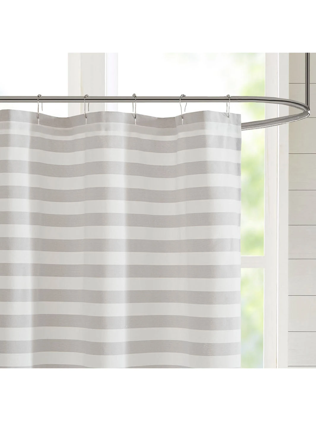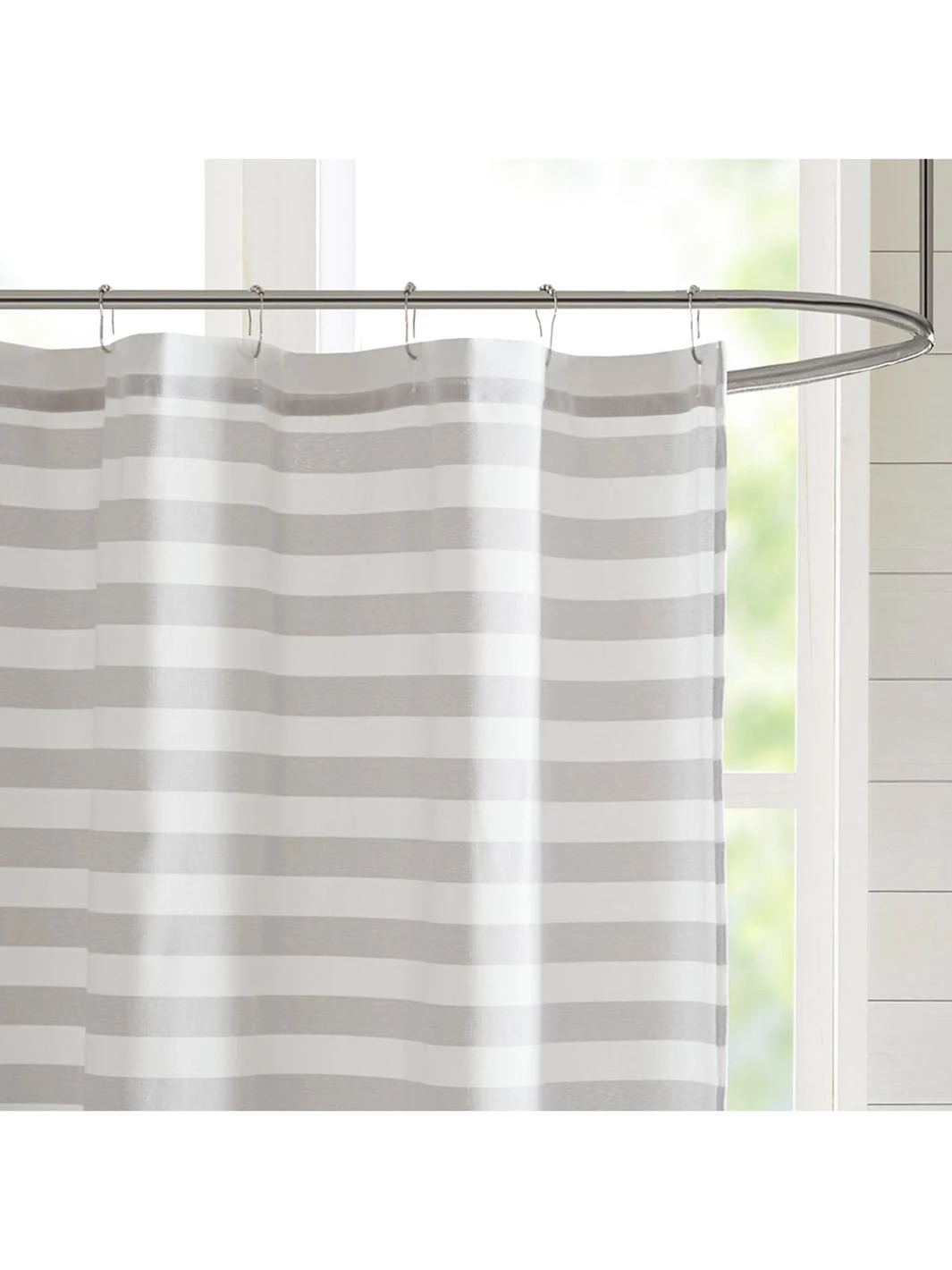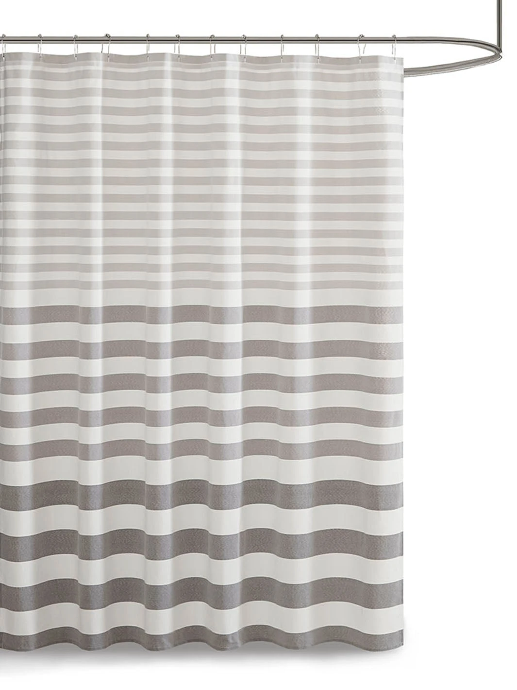 Add a chic casual touch to your bathroom with our Madison Park Aviana Stripe Blended Yarn Dyed Woven Shower Curtain. This 72”x 72” shower curtain features a soft and classic grey ombre stripe pattern for a simple, yet modern look. The woven yarn dyed fabric of the stripe shower curtain is made from 55% cotton and 45% polyester, for a soft hand feel that is also machine washable for easy care. Finished with 12 button holes for easy hanging; add this cotton-rich shower curtain to your bathroom for the perfect fresh and casual update.