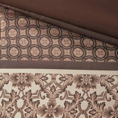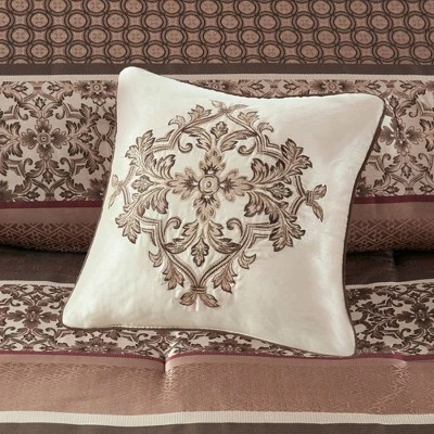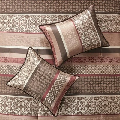 Go ahead and bring a little stylized warmth back to your bedroom lineup with this eye-catching Cambridge 7-Piece Jacquard Comforter Set. Adorned in luxuriously detailed botanical patterns mixed with bold stripes that’ll enhance the look and feel of any room in your home, this truly stunning bed set – sized to fit a queen, king, or California King bed – includes a 100% polyester comforter, tailored bed skirt, 2 king shams, and 3 gorgeous decorative pillows, each one accented in a unique design and color. Polyester’s a major bonus for bed set’s because it’s easy to wash, resilient over time, and great at fighting off nasty stains. Whether they’re used in your master bedroom or a guest room, elegant comforter sets like these can elevate any space from drab to daring in the blink of an eye. Guaranteed to cradle you in comfort all year long, you’ll feel a relaxing vibe sweep over your entire body the moment your face meets the pillow. Sweet dreams! Comes in blue and red. Machine wash.