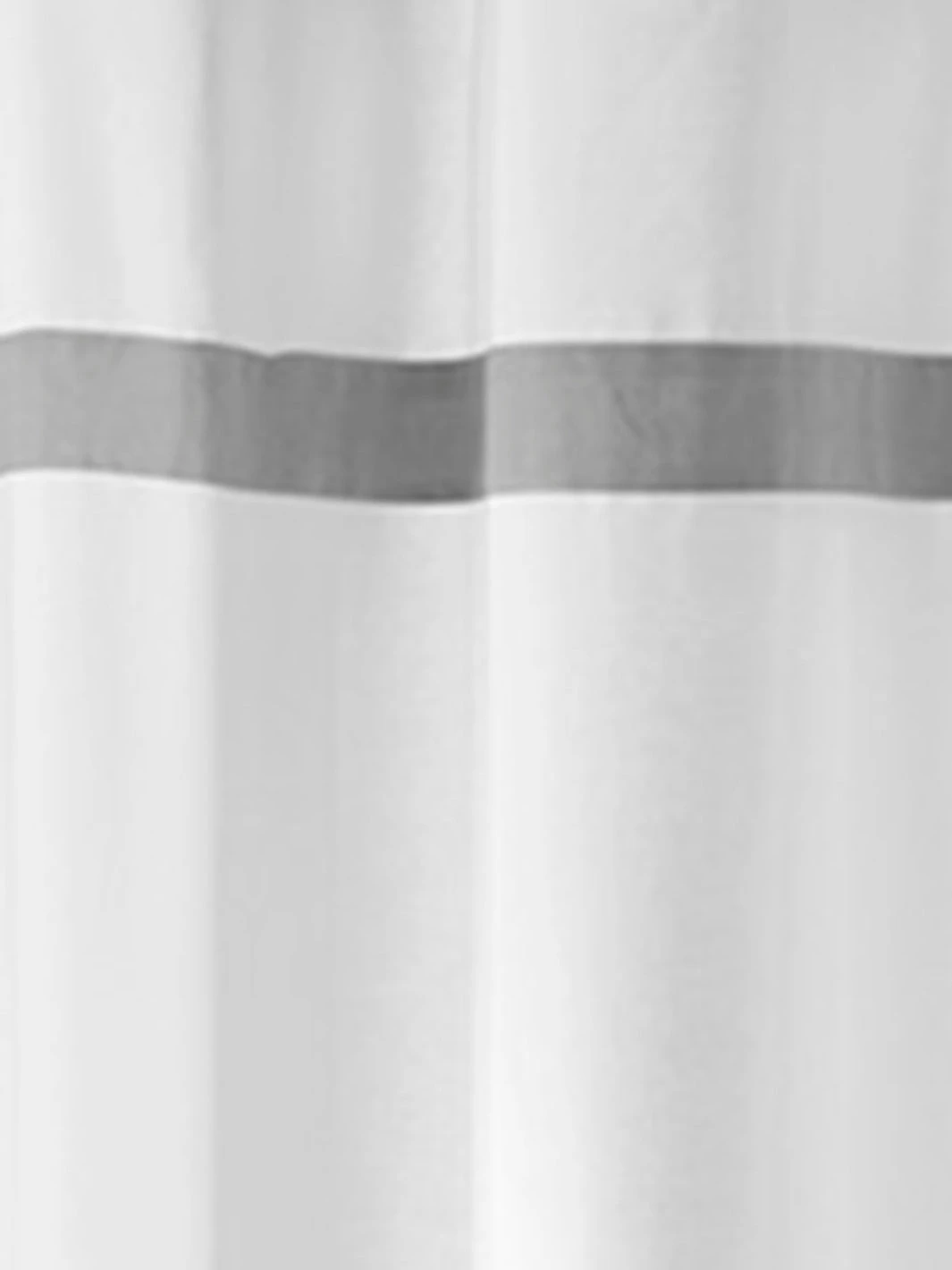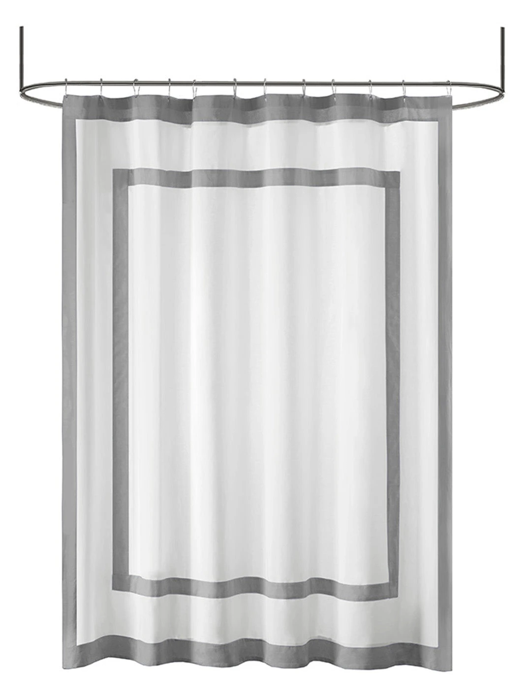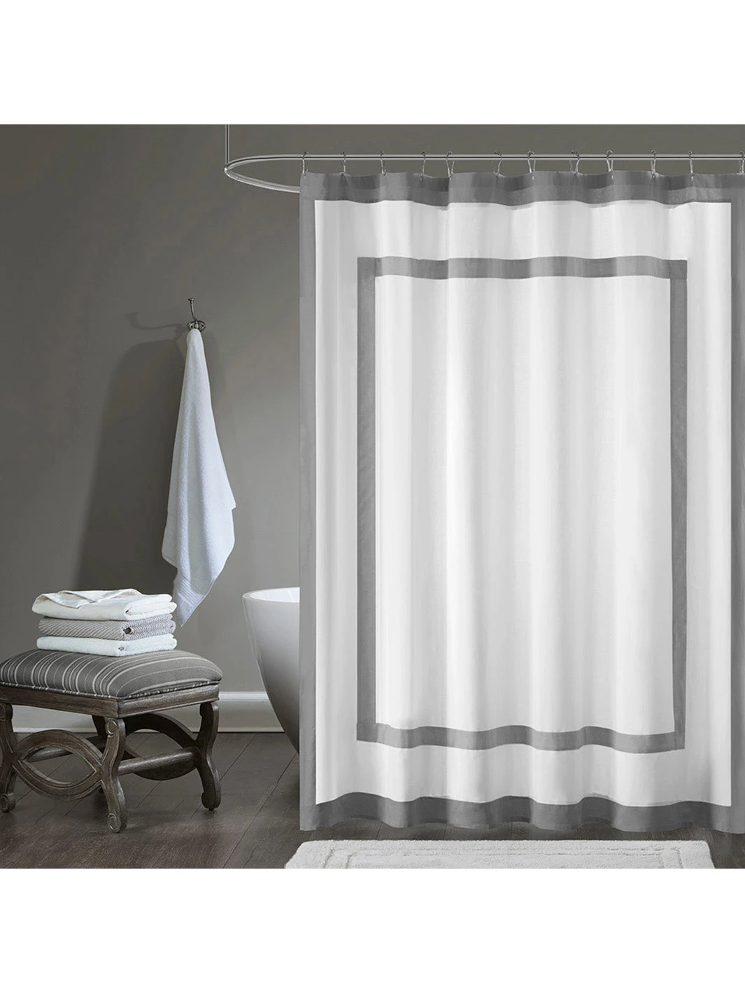The Madison Park Greyson shower curtain creates a contemporary update to your space. Pieced, cotton duck fabric in solid white is in the center while a charcoal grey creates an outer border and inset border for a simple yet colorful new look.