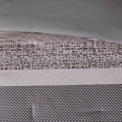 Give your bedroom a new luxurious look with the Harmony 7 Piece Jacquard Comforter Set. This jacquard comforter features a navy and grey stripe design of several different motifs on the face with a solid grey reverse, for a chic transitional look. The 2 matching shams complement the design of the comforter to complete this glam comforter set. Also included is a solid navy bed skirt and 3 decorative pillows with embroidery and pleated details provide the finishing touches. Machine washable for easy care, this jacquard comforter set brings a sophisticated update to your bedroom decor.