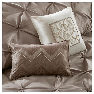 Invigorate your space with the Madison Park Essentials Joella 24 Piece Room in a Bag. The lavish tufted details flaunted on the comforter, shams, and window valances deliver an elegant statement in bold, natural hues. A large border frames the luxurious comforter, adding charm and dimension to the bedding set. Matching shams echo the motif seen on top of the bed, creating an elegant look in your space. An included microfiber sheet set and bed skirt complements the bedding collection and offers exceptional comfort and style. Two Euro shams and four embroidered decorative pillows help to complete the bedding set, giving it a finished look. Accompanying this bedroom set are four window panels with four tie backs to keep curtains drawn open, while two tufted valances provide the finishing touches to your bedroom. This bedding set may come in rolled or compressed packing and will need to be fluffed up. Use a steam iron to help remove wrinkles easier.