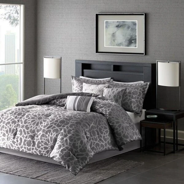 The Carlow Comforter Set provides a bold new statement in your space. A rich charcoal is woven with a silver metallic creating this glamorous geometric medallion motif. Three decorative pillows use embroidery and fabric manipulation techniques to give the perfect finishing touches to this look. 100 Percent Polyester Jacquard 7 Piece Comforter Set.