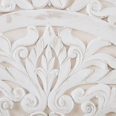 - Intricate off white medallion carved design in durable resin material for a unique 3D effect
