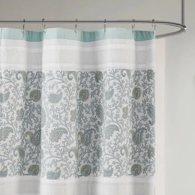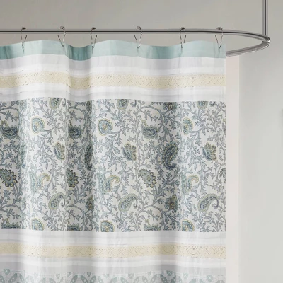 For a charming and stylish touch to your bathroom, our Stella cotton shower curtain holds all of the perfect elements to do shabby chic the right way. A mixture of soft hue are printed in a paisley design alongside pin tucked and beautiful lace taping for a delicate and feminine update. Finished with 12 button holes at the top makes this shower curtain easy to assemble hooks and simply hang on any standard rod (hooks and rod not included). This shower curtain is also OEKO-TEX certified, meaning it does not contain any harmful substances or chemicals, ensuring quality comfort and wellness. Each shower curtain measures 72×72″ and is machine washable for easy care; to keep this shower curtain in the best condition a water repellant liner is highly recommended (liner not included and should be purchase separately).